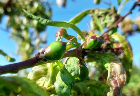 A nyárias időjárással jellemezhető április eleje után beköszöntött a csapadékos időjárás, ami a lehűlés ellenére biztosítja számos kórokozó aktivizálódását. A következő példákon keresztül láthatjuk, mikor mire kell figyelemmel lenni ahhoz, hogy a várható termés veszteséget csökkentsük. Az őszibarack tafrinás levélfodrosodása jó példa a hidegtűrő és korán fertőző gombára. Az érzékeny fajtákon okozott levéltorzulásokat érdemes eltávolítani és a csapadék mentes napokon javasolt felszívódó szerrel permetezni. A beteg levelek eltávolítása után a permetezéssel egy időben a levélen keresztül ható növénykondicionáló készítmény kijuttatása is javasolt.